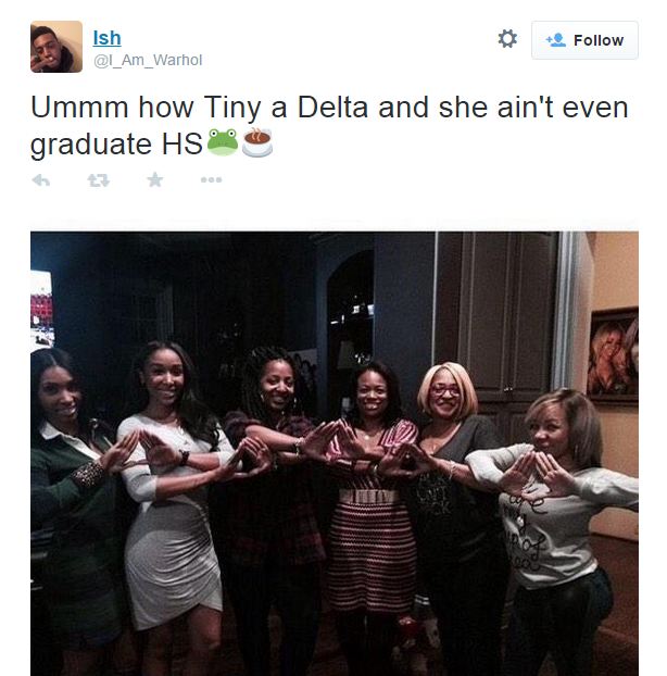Tiny was recently pictured throwing up Delta Sigma Theta AND Alpha Kappa Alpha sorority hand signs in new Instagram pictures…