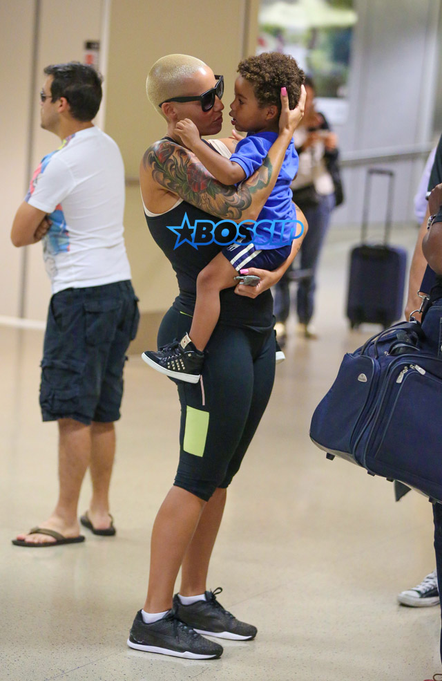 Amber Rose covers her boy Sebastian with kisses as they meet up at LAX