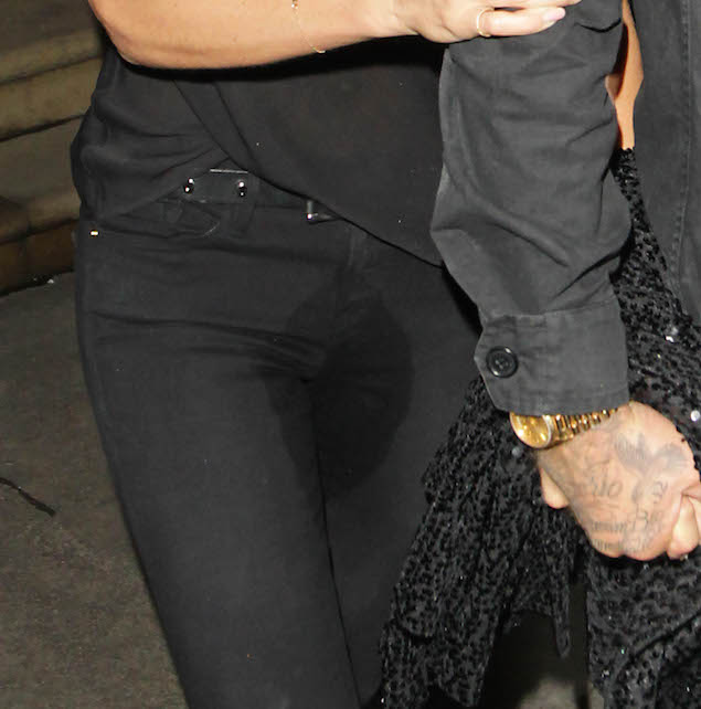 Victoria Beckham and David Beckham seen here leaving Victoria’s Dover street shop 1st anniversary in London and seems to have a suspicious wet patch on her trousers as she leaves holding her husbands hand at 2.40am after partying on into the early hours in the morning with son Brooklyn Beckham and a few close friends.