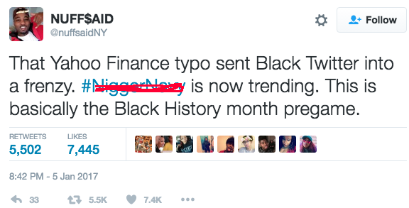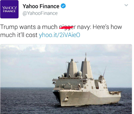 Yahoo Finance has ended this first explosive first week of 2017 with a loud racial bang. The finance end of Yahoo tweeted this HUGE ‘typo’ after reporting on Trump’s call for a bigger Navy: