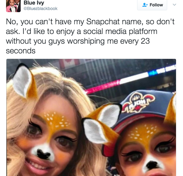 Queen Bey proved yet again that she’s the greatest to ever snatch wigs and headlines when she teased her (or Blue’s?) super top-secret SnapChat account on Instagram just moments after dropping out of Coachella in a hilariously random series of events that sent the Hive into an endless tizzy.