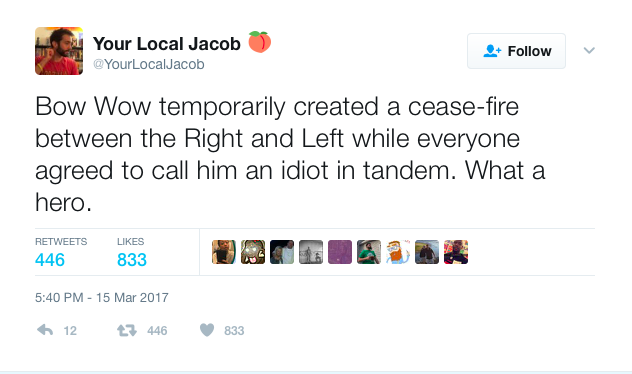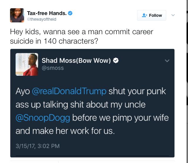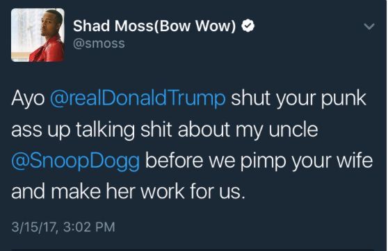 Bow Wow can’t do anything right. Like, literally zero things. It should be easy to clown Donald Trump for so many things. His vag grabbing. His tiny hands. His stupidity. But Bow Wow took it a step too far by saying he’d pimp out Don’s wife, Melania. How do you diss the worst human on the planet and still come out looking like a bum?