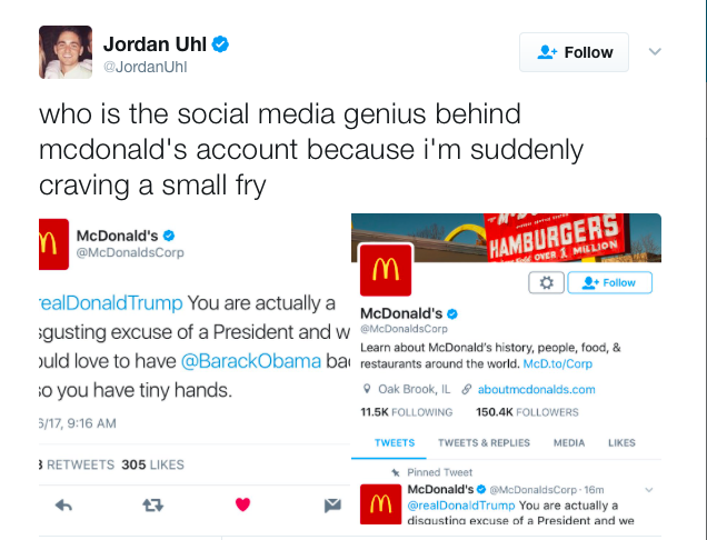 For a second there, we were all on our way to get Big Macs. Because for about 30 minutes McDonald’s was the most fire twitter account in America. They sent out the above tweet clowning Trump for his tiny hands. But all was lost because it turns out they were hacked.