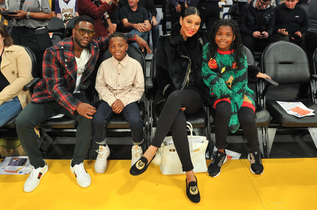 Kevin Hart also brought his family out for the game, that’s his son Hendrix sitting between him and wife Eniko and daughter Heaven next to Eniko.