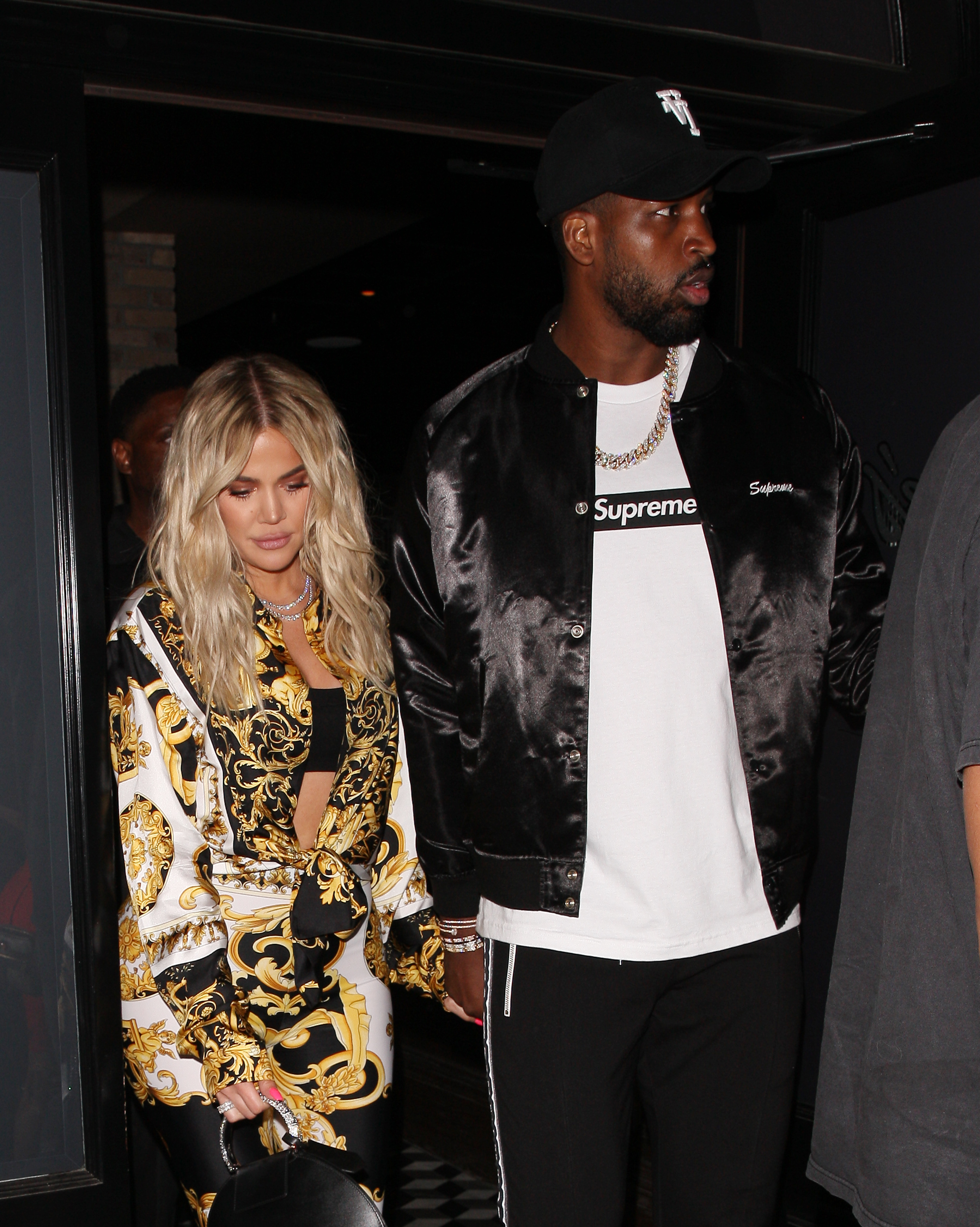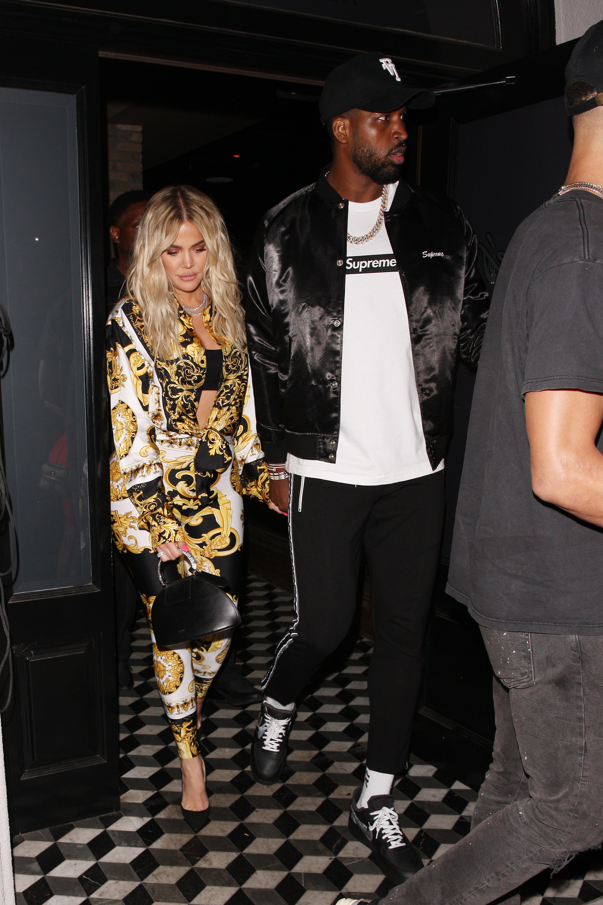 Khloe rocked head to toe Versace from the #VersaceTribute collection for the dinner date while Tristan kept it casual in black.