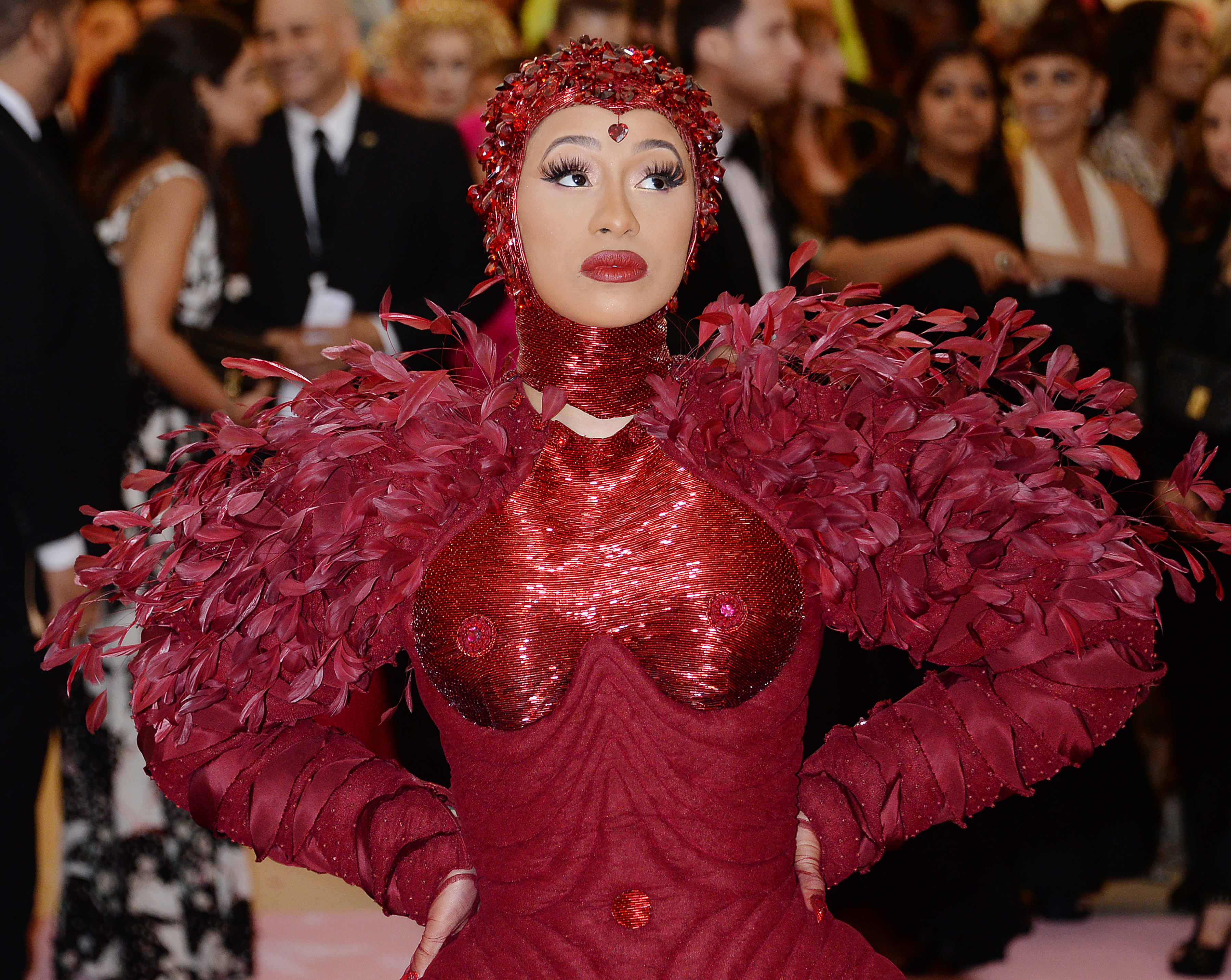 Cardi B wore a burgundy Thom Browne floor-length gown with a train…