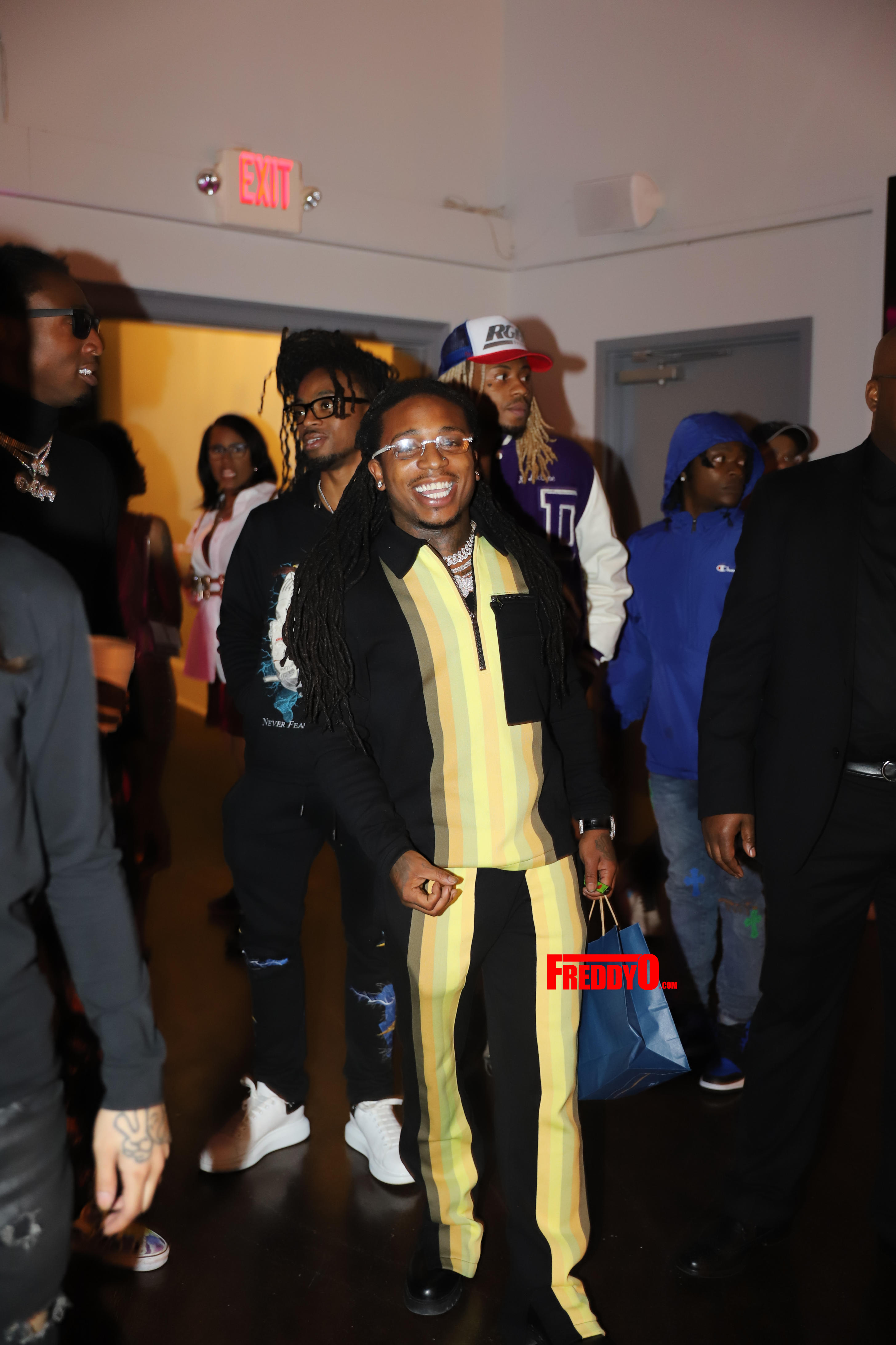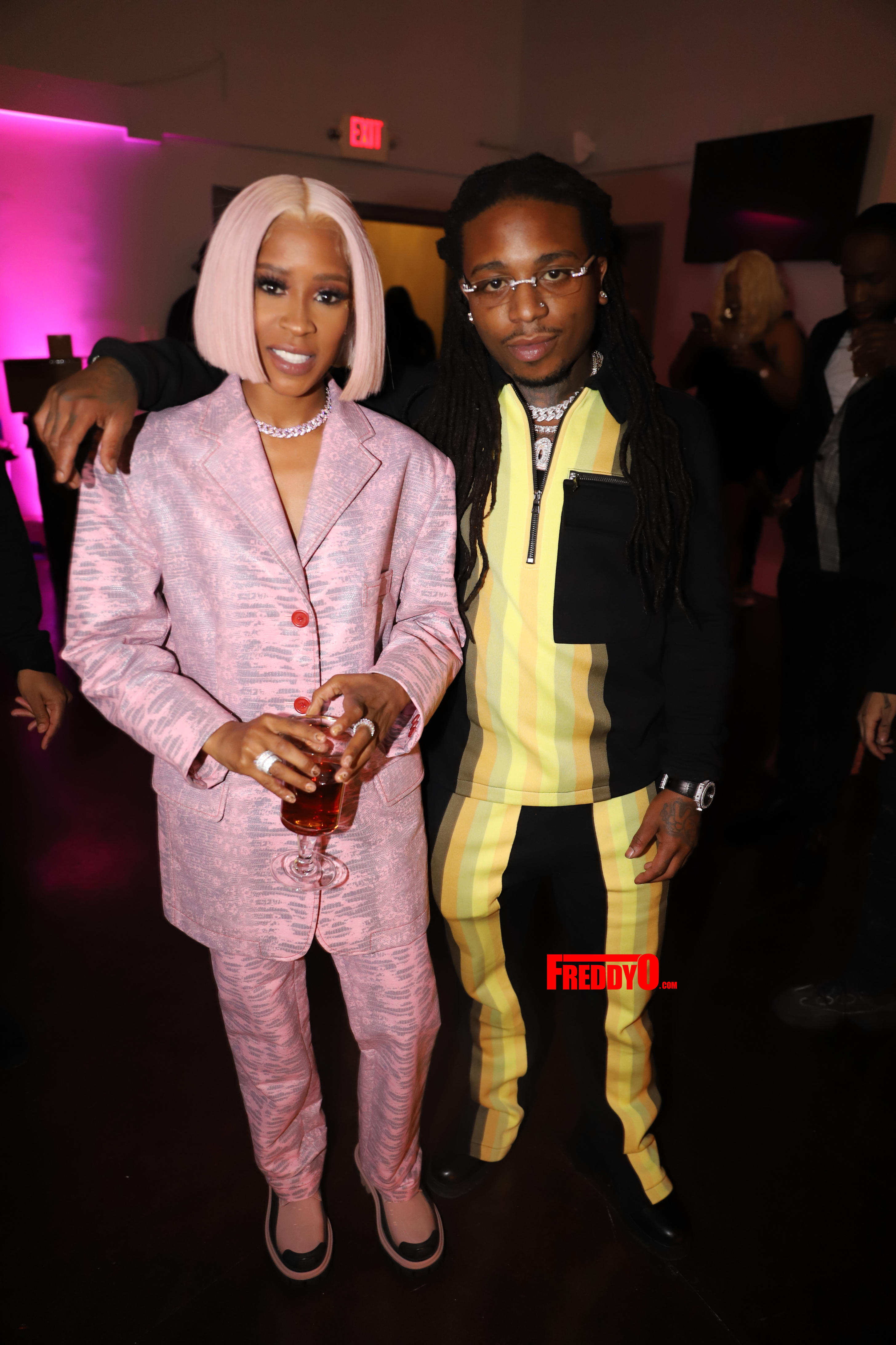 For the extravagant affair, the Detroit native was styled by Icon Tips who outfitted her in a custom gold suit that sparkled amid pyrotechnics that lined the party’s entryway.