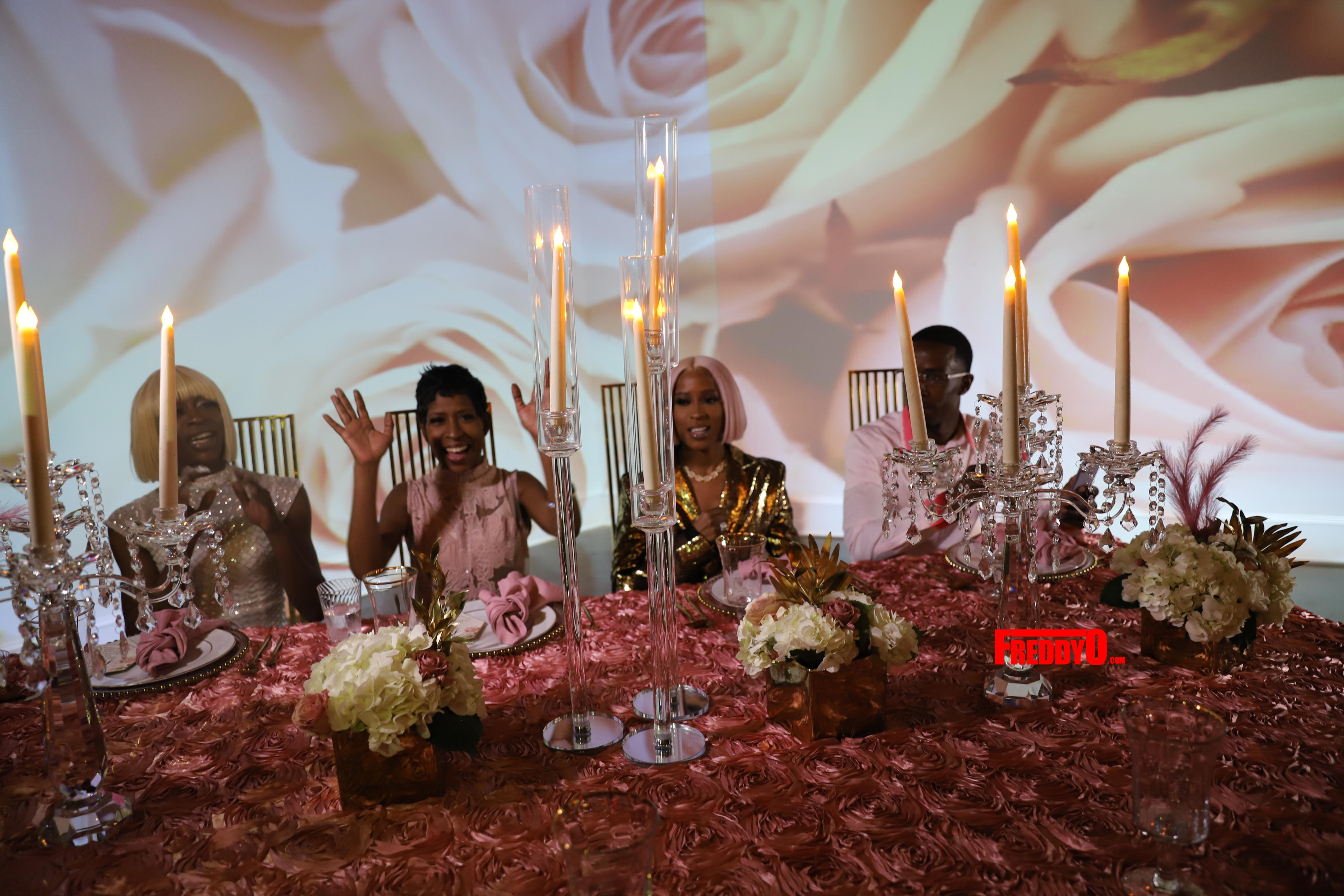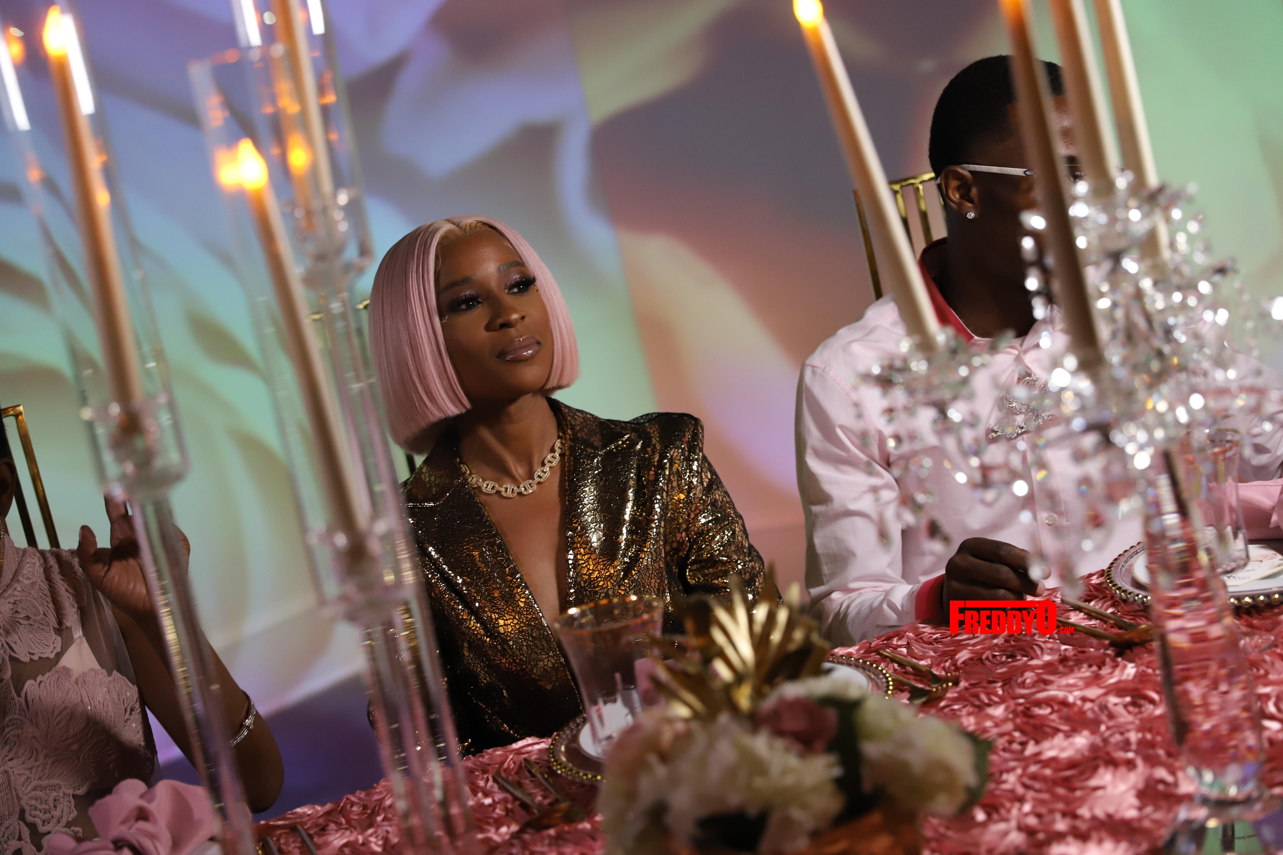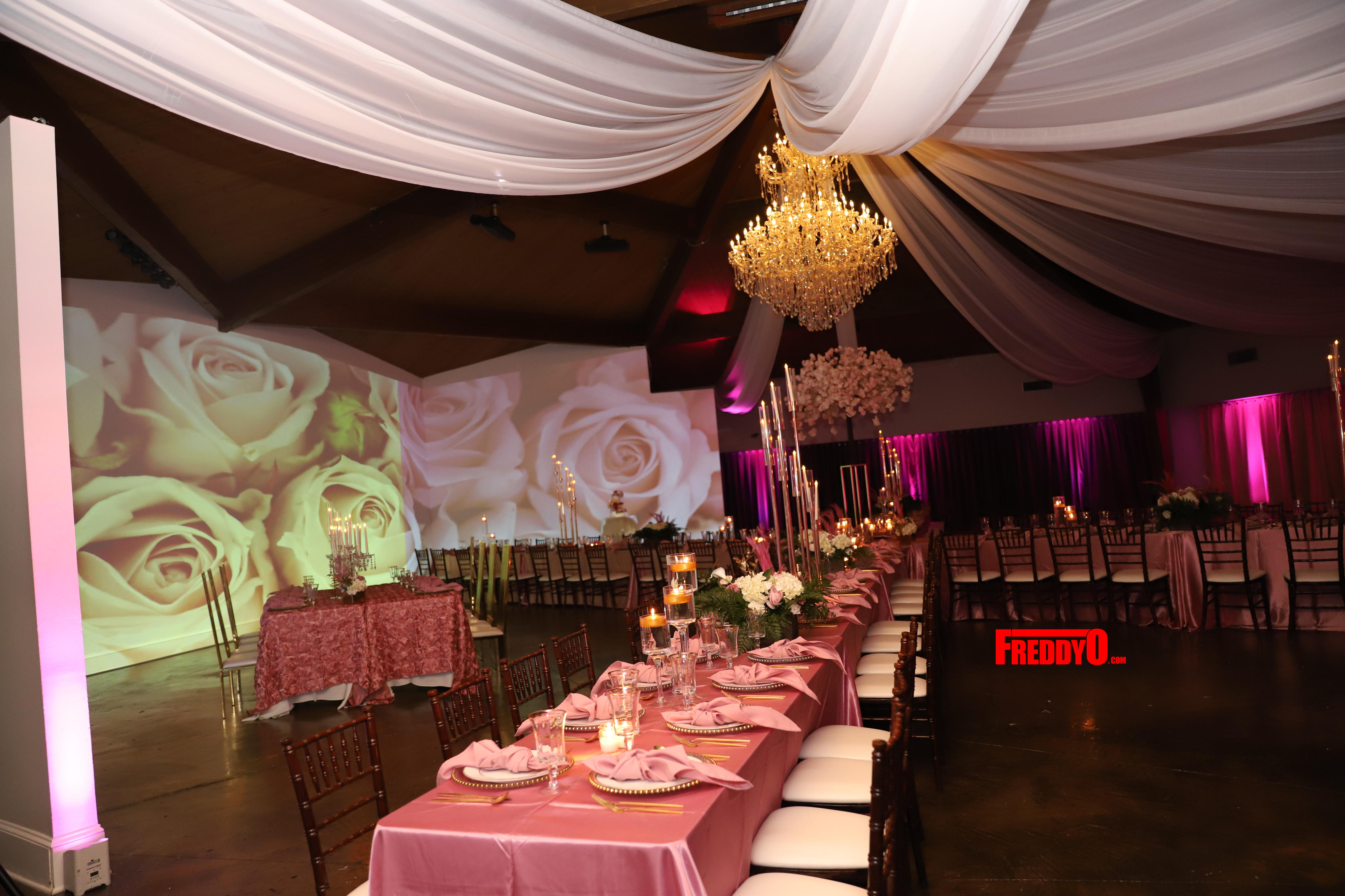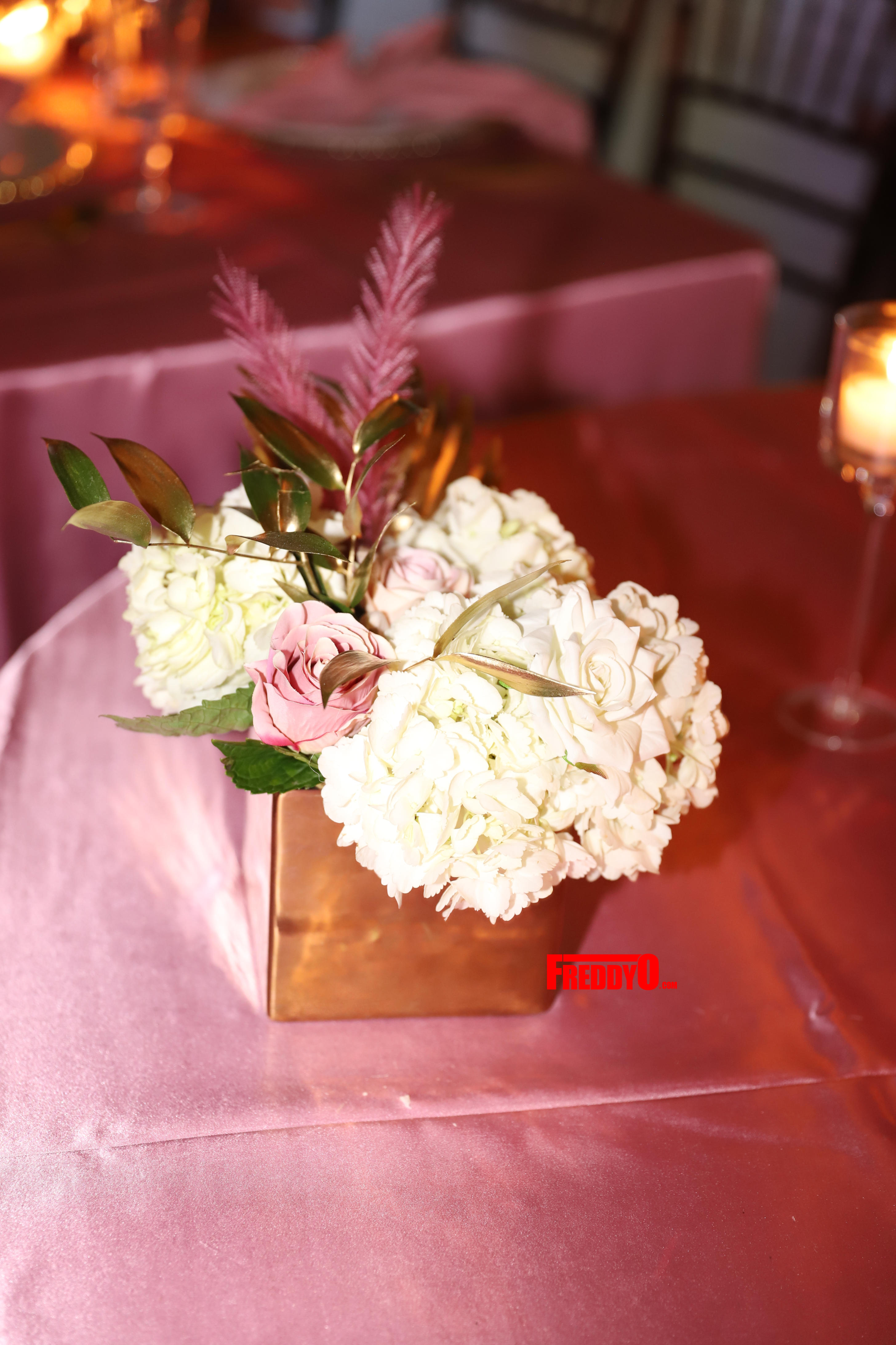 Dej’s all-pink affair also included a custom cake, fantastic floral arrangements, swanky accouterments, and a candlelit dining experience.