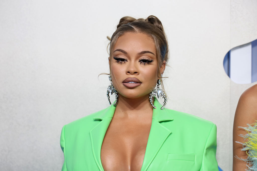 Latto donned lime green Ludo Bokuchava for the VMAs red carpet with stunning makeup and blinged-out earrings.