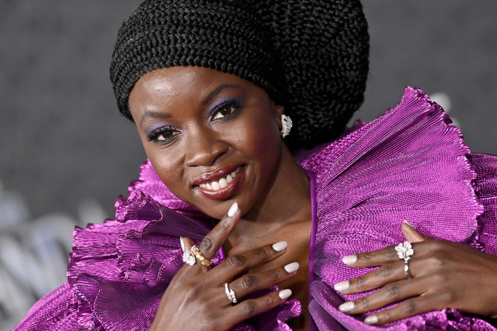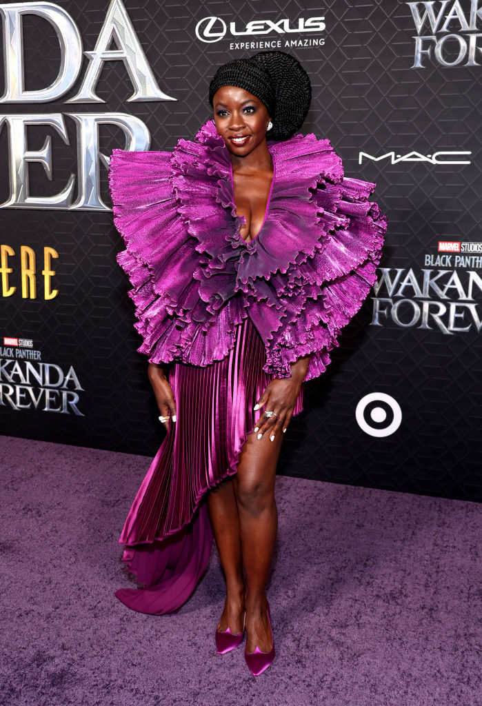 She was matched in purple by Danai Gurira who reprises her role as Dora Milaje general Okoye in the film and shut the carpet down in Robert Wun.