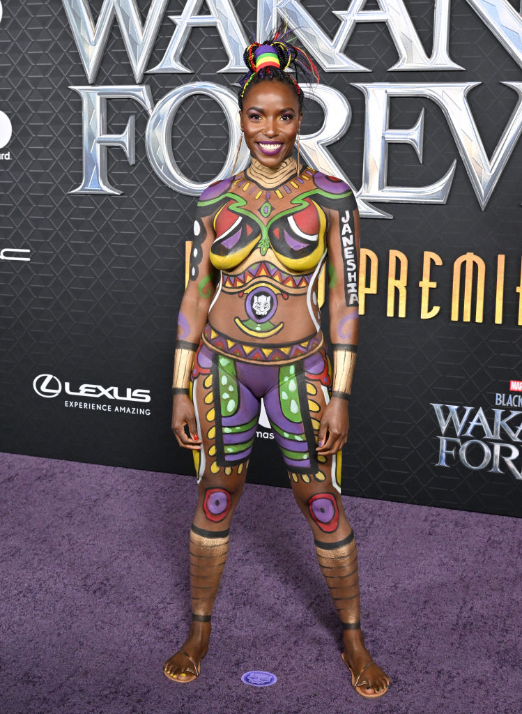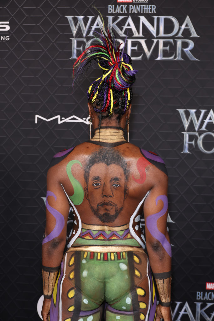 and Dora Milaje actress Janeshia Adams-Ginyard who donned body paint that included Chadwick Boseman’s face on her back.