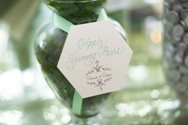 The dessert room was laced with big beautiful jeweled trees filled with bright white orchids, hanging glass balls, candles and diamonds. The dessert table was covered with blinged out candy apples, cake pops, personalized Hershey Chocolate Bars and a yummy candy bar provided by Sugarfina of Beverly Hills. Guests dined on a full food buffet of sliders, mini crab cakes, sushi, and much more!