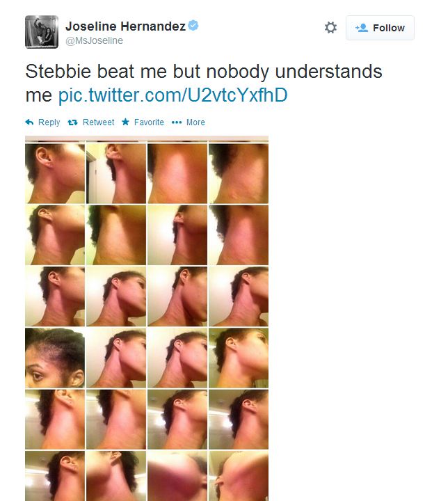 What the hell is going on Joseline’s Twitter timeline right now?? The reality star posted several pictures of her bruised face and scratched up neck claiming that her hubby Stevie J brutally beats her. “Stebbie beat me but nobody understands me,” one of the tweets read. Joseline also posted photos of her eating off of Anna Benson’s Versace plates and popping pills.