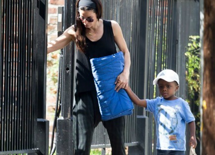 Sandra Bullock was spotted doing drop off and pick up runs with lil precious cutie patootie Louis Bardo who kept up his stoic stoneface stare for the paps.
